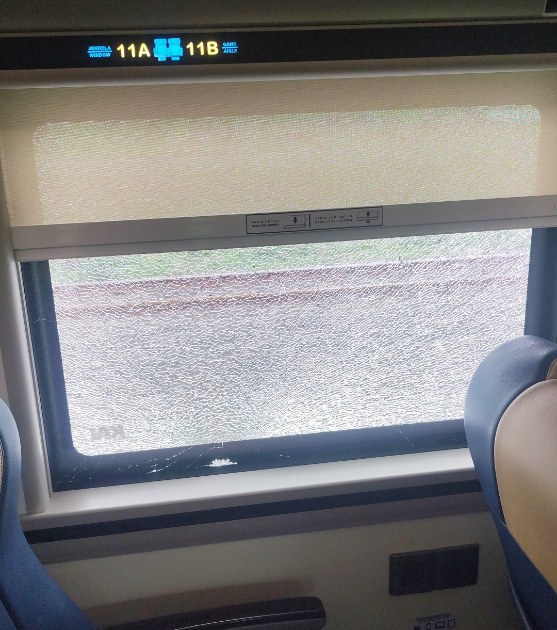 Kondisi kaca kereta KA 154 Ranggajati relasi Cirebon–Jember yang pecah setelah terkena lemparan batu di KM 120+5, wilayah antara Stasiun Bagor–Nganjuk, Jumat (23/1/2026). (Foto: Ist)…