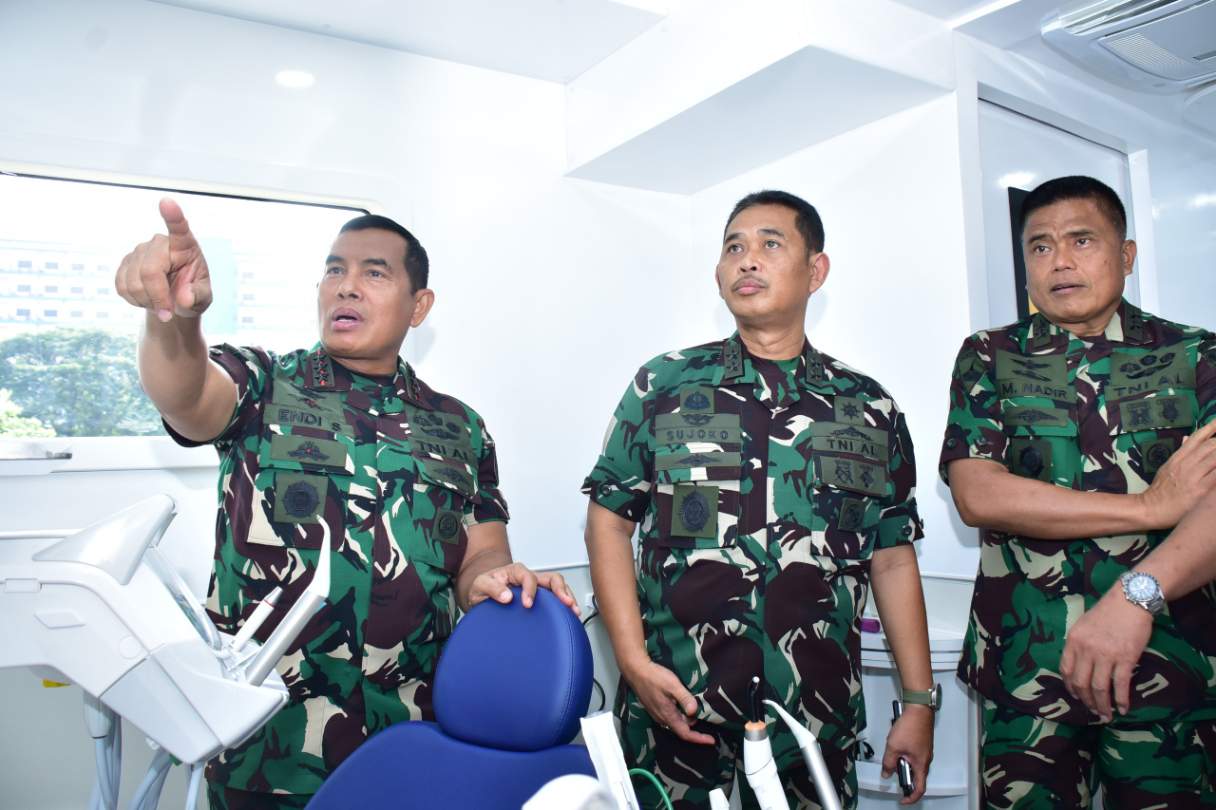 Pangkormar Letjen TNI (Mar) Endi Supardi meninjau kendaraan Mobile Medical Check Up (MCU) dan Mobile Dental Clinic (MDC) usai acara serah terima di Taman Wanarata, Mako Kormar, Jakarta, Senin (27/10/2025).(Ist)