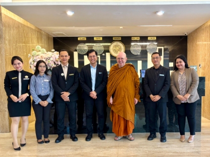 Ajahn Brahm disambut oleh karyawan dan staf Yasmin Hotel, Karawaci, Tangerang saat tiba di lokasi acara talk show dan retreat yang berlangsung selama dua hari. (Foto: Ist)