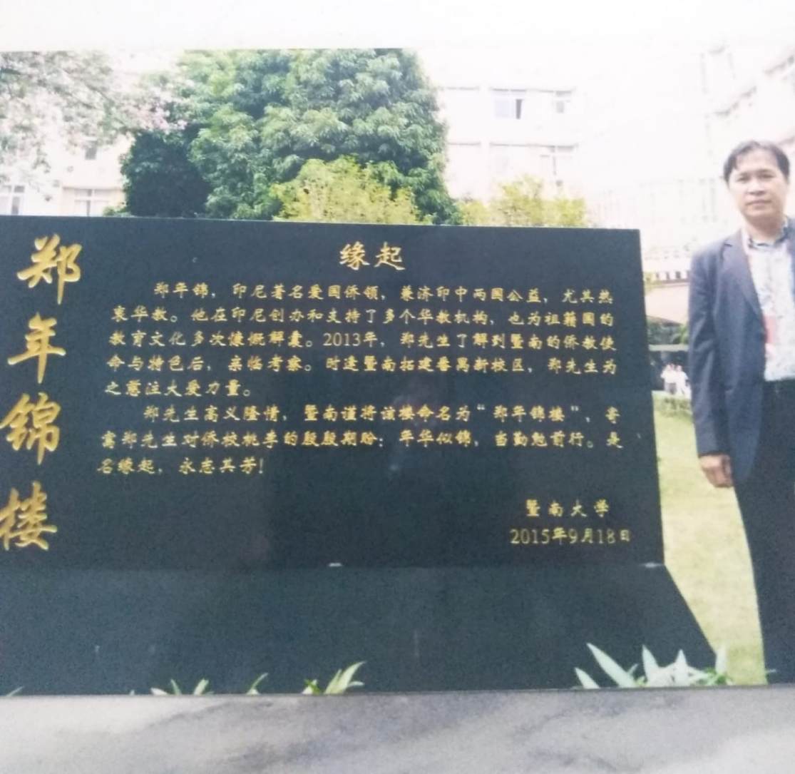 Wira (Huang De Wei) di depan Jinan University Chinese Language College, Guangzhou, Tiongkok — kini dinamai Gedung The Ning King (Zheng Nian Jin) sebagai bentuk penghormatan kepada almarhum.(Foto: Istimewa)