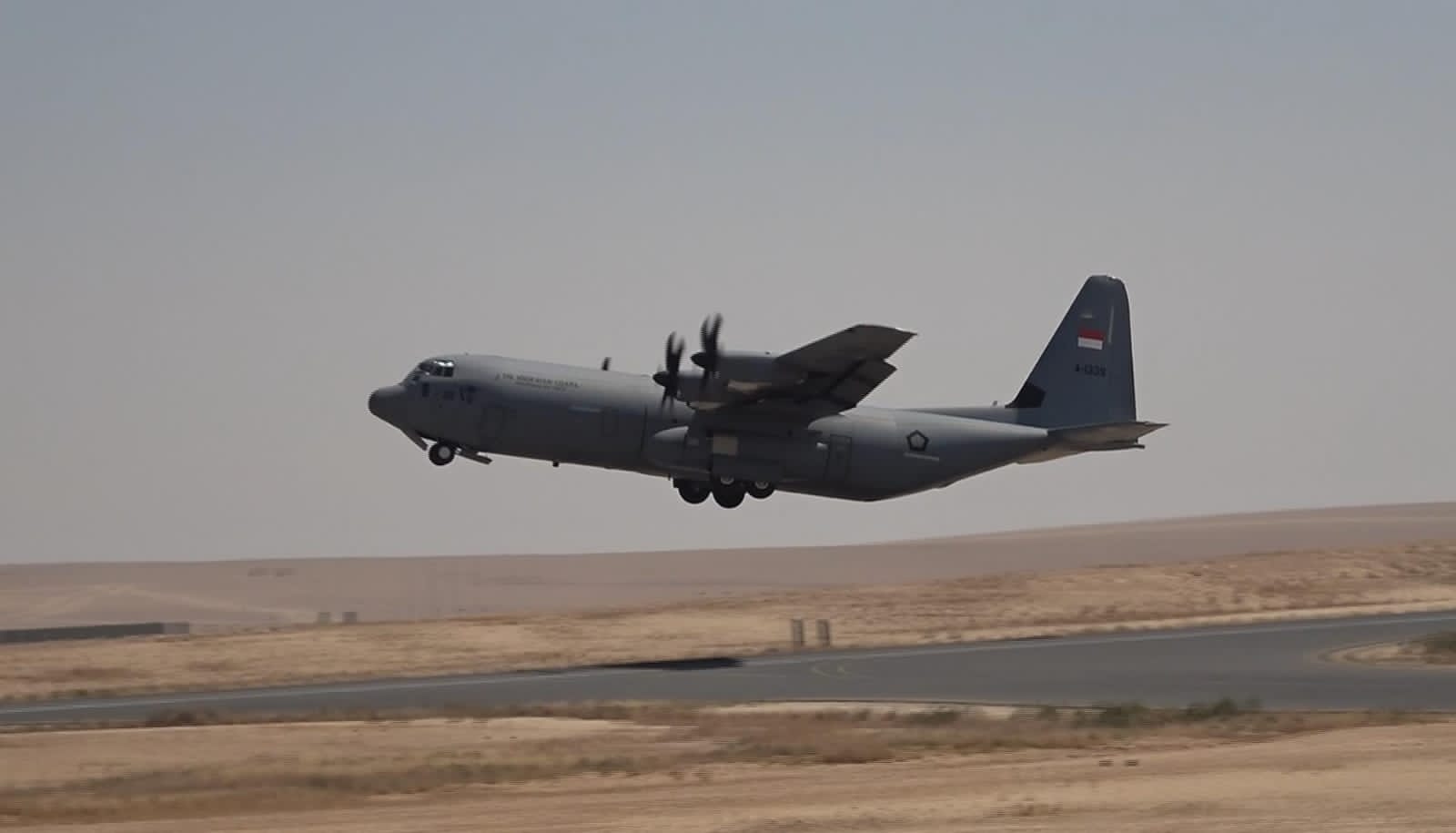 Dua pesawat C-130J Super Hercules TNI AU terbang dalam formasi bersama Angkatan Udara Kerajaan Yordania, menurunkan 10,3 ton bantuan logistik berisi makanan dan kebutuhan pokok, Senin (18/8/2025).