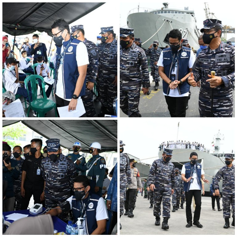 Pada kesempatan ini saat meninjau kegiatan vaksinasi, Menteri Pariwisata dan Ekonomi Kreatif Dr. Sandiaga Salahuddin Uno, B.B.A., M.B.A juga menerima vaksin dosis kedua bersama para pelajar didampingi Wakil Kepala Staf Angkatan Laut (Wakasal) Laksamana Madya TNI Ahmadi Heri Purwono, S.E., M.M dan Panglima Kolinlamil Laksma TNI Erwin S. Aldedharma, S.E., M.M., M.Sc., para pejabat utama Mabesal, Kadisjarahal, Danlantamal III, serta pejabat Kemenparekraf dan Walikota Jakarta Utara.