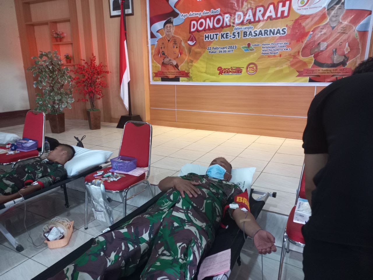 TIMIKA-Sambut Hari Ulang Tahun Basarnas ke-51 tahun 2023, Babinsa Kodim 1710/Mimika ikuti kegiatan Donor Darah bertempat di Aula Kantor Basarnas Timika, Jl. Yos Sudarso Distrik Wania, Kabupaten Mimika, Rabu (22/02/2023).