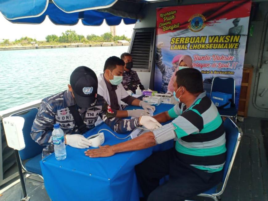 JAKARTA, NP – Pangkalan TNI AL Lhokseumawe mengerahkan satu kapal patrol yakni Kapal Angkatan Laut (KAL) Bireun I-1-70 untuk menjadikan tempat serbuan vaksinasi bagi nelayan yang sedang melaut, Kamis (29/7/21).