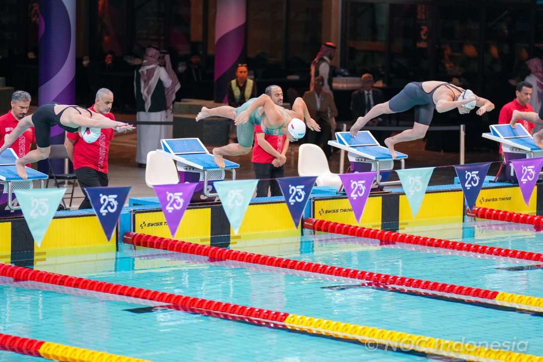 Suasana penuh semangat di area kolam renang Riyadh saat Tim Indonesia berlaga pada hari terakhir ISG 2025. (Foto: NOC Indonesia/Mochammad Rifqi)