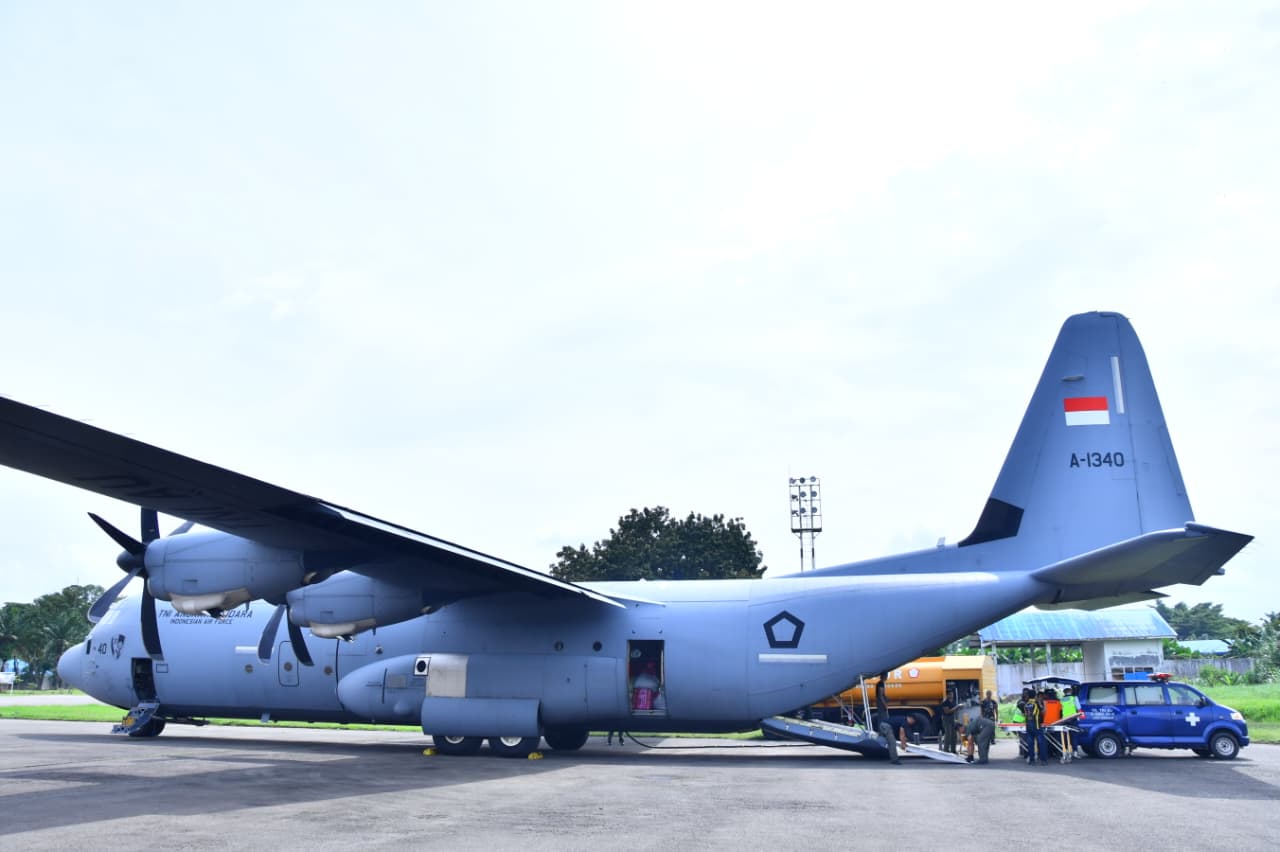 Pasien lansia dievakuasi menggunakan pesawat angkut C-130J Super Hercules TNI AU untuk mendapatkan penanganan medis lanjutan di Medan.(Foto: Ist)