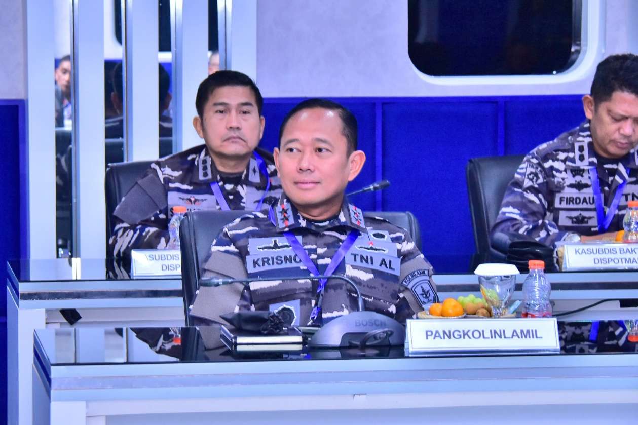 JAKARTA, NP – Panglima Komando Lintas Laut Militer Laksda TNI Hudiarto Krisno Utomo, PSC(j) M.A., M.M.S., CHRMP bersama Aspotmar Pangkolinlamil Kolonel Laut (P) Teguh Iman Wibowo, M.Tr.Opsla., menghadiri Rapat Kerja Teknis Potensi Maritim TNI AL Tahun 2025 yang berlangsung di Gedung Neptunus, Mabesal Cilangkap, Jumat (28/2). Acara ini dibuka secara langsung oleh Aspotmar Kasal Mayjen TNI (Mar) Dr. Hermanto dengan mengangkat tema “Meningkatkan Profesionalitas dan Integritas Insan Potmar Dalam Rangka Mendukung Pembangunan Kekuatan Pertahanan Negara di Laut Menuju Indonesia Emas 2045”, serta dihadiri pejabat utama Mabesal, Para Pangkotama TNI AL dan diikuti melalui video conference di seluruh jajaran TNI AL.