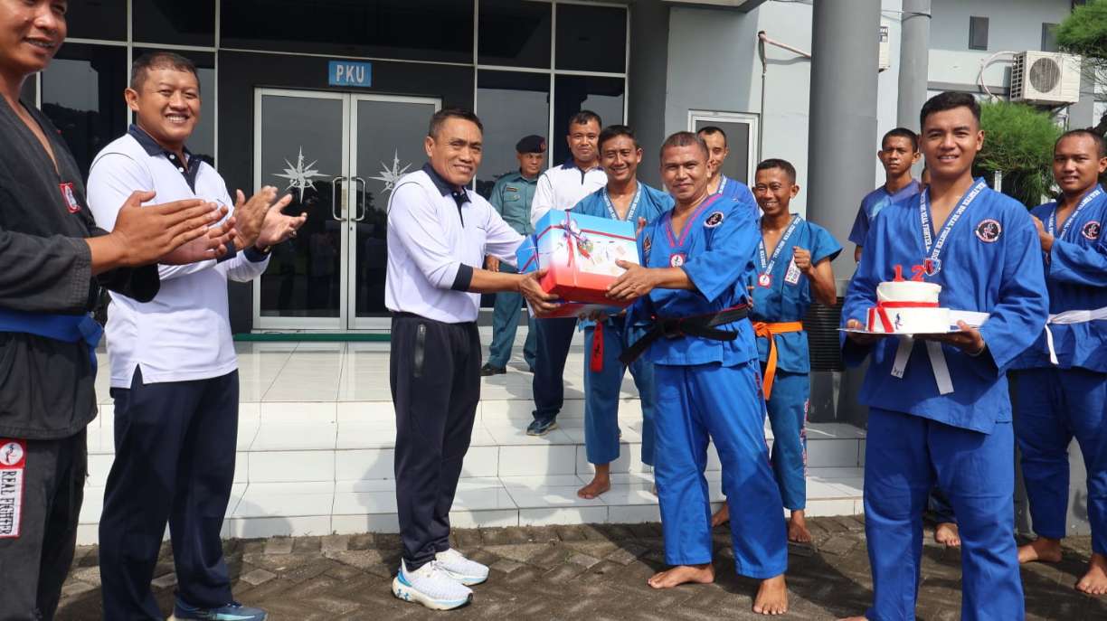 JAKARTA, NP – Suasana latihan rutin para atlet bela diri Real Fighter di Markas Komando Satlinlamil 2 mendadak berubah pada Selasa (18/11). Komandan Satlinlamil 2, Kolonel Laut (P) Akhmad Alif Saifuddin Z., M.Tr.Hanla, bersama Wakil Komandan, para Kepala Satuan Kerja, serta jajaran Perwira Staf datang memberikan kejutan dalam rangka memperingati 12 tahun berdirinya olahraga bela diri tersebut.