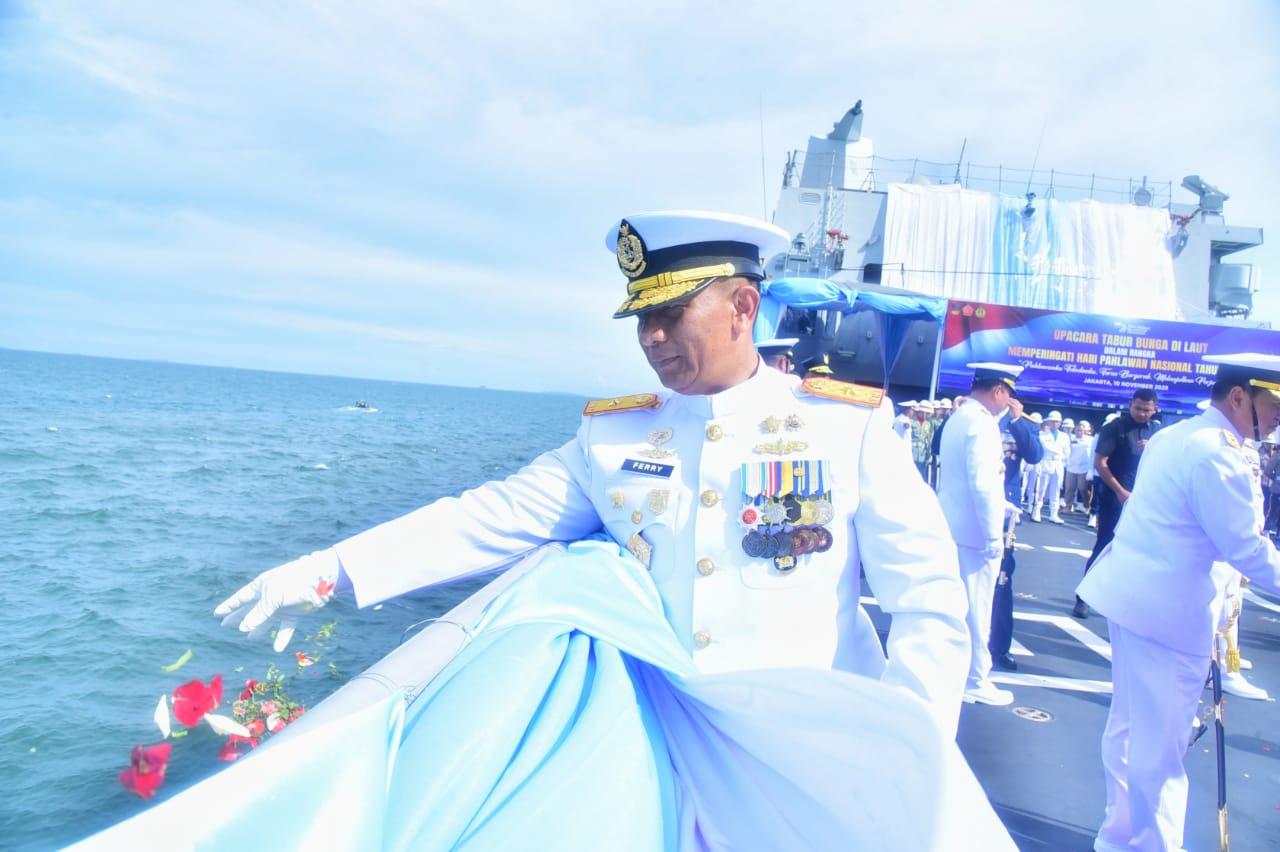 Wadan Seskoal Laksma TNI Ferry Supriady melakukan tabur bunga di laut dalam rangka peringatan Hari Pahlawan 2025. (Ist)