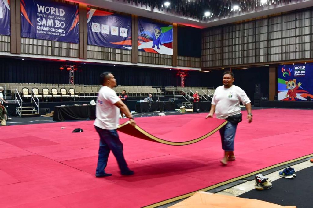 Petugas menata matras pertandingan di JSI Resort Convention Hall, Bogor, Kamis (2/10/2025), jelang pembukaan Kejuaraan Dunia Sambo Remaja dan Junior 2025.(Foto: PP Persambi) CIAWI, NP…
