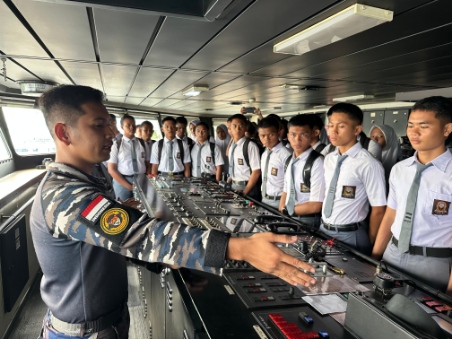 Siswa SMAN 1 Matauli Pandan mendengarkan penjelasan dari prajurit TNI AL saat mengikuti warship tour di KRI Banda Aceh-593 yang sandar di Pelabuhan Sibolga, Sumatera…