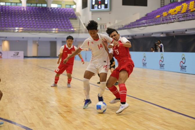 Aksi penuh semangat para pemain Timnas Futsal Indonesia saat menundukkan Australia 3–1 di Indonesia Arena, Jakarta. Laga ini jadi ajang pemanasan menuju SEA Games 2025.(Ist)…