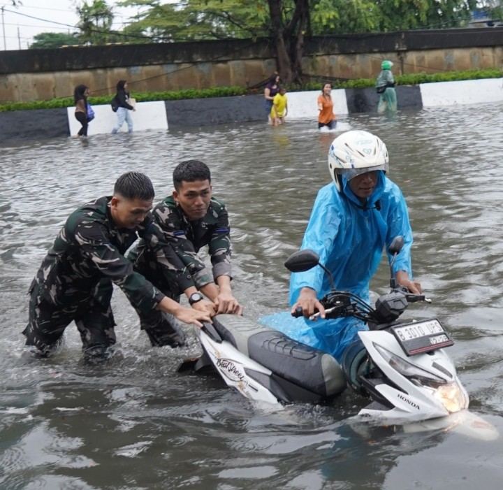 Prajurit TNI AL membantu mengevakuasi sepeda motor warga yang mogok akibat banjir di Jalan Raya Pademangan, Jakarta Utara, Selasa (12/1/2026). (Foto: Ist) JAKARTA, NP –…
