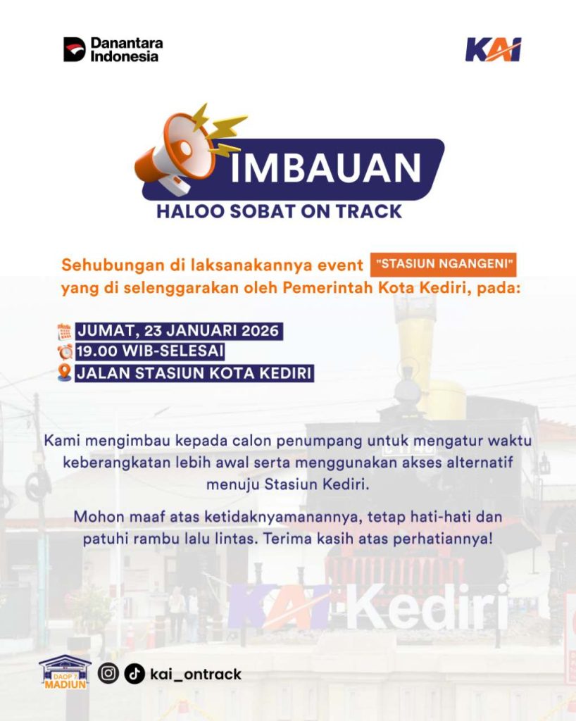 MADIUN, NP – PT Kereta Api Indonesia (Persero) Daerah Operasi 7 Madiun mengimbau para pelanggan kereta api, khususnya calon penumpang yang akan berangkat dari Stasiun…