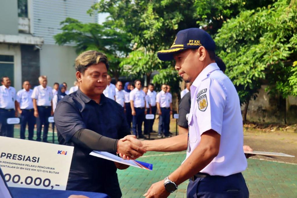 Vice President KAI Daop 7 Madiun Ali Afandi menyerahkan piagam penghargaan kepada warga Blitar yang berjasa menggagalkan pencurian baut penambat bantalan rel di wilayah Daop…