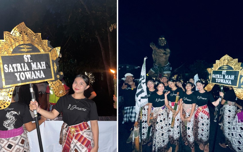 Para gadis dari Sekeha Teruna Teruni (STT) Satria Maha Yowana memamerkan kain Tenun Cagcag karya Banjar Dinas Waliang, Karangasem di momen pawai ogoh-ogoh atau pengrupukan.…