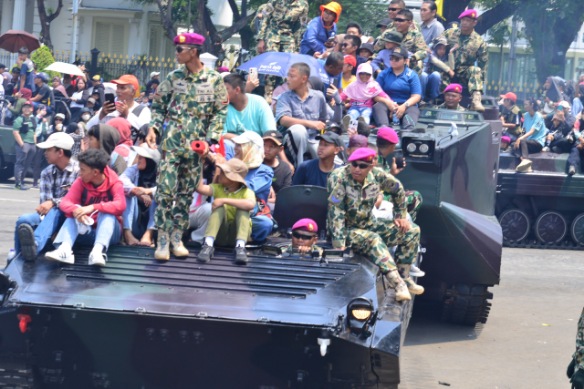 Ribuan warga padati Monas di HUT ke-80 TNI. Tampak saat warga tertarik menaiki alutsista Marinir seperti BMP-3F, BTR-4M, dan LVT-7.(Ist) JAKARTA, NP – Ribuan warga…