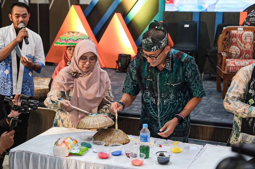Menparekraf Sandiaga Uno bersama Ketua Dekranasda Kota Banjarmasin Siti Wasilah menghias tanggui ukuran kecil yaitu topi khas dari Suku Banjar. (Foto:Ist) BANJARMASIN, NP – Menteri…