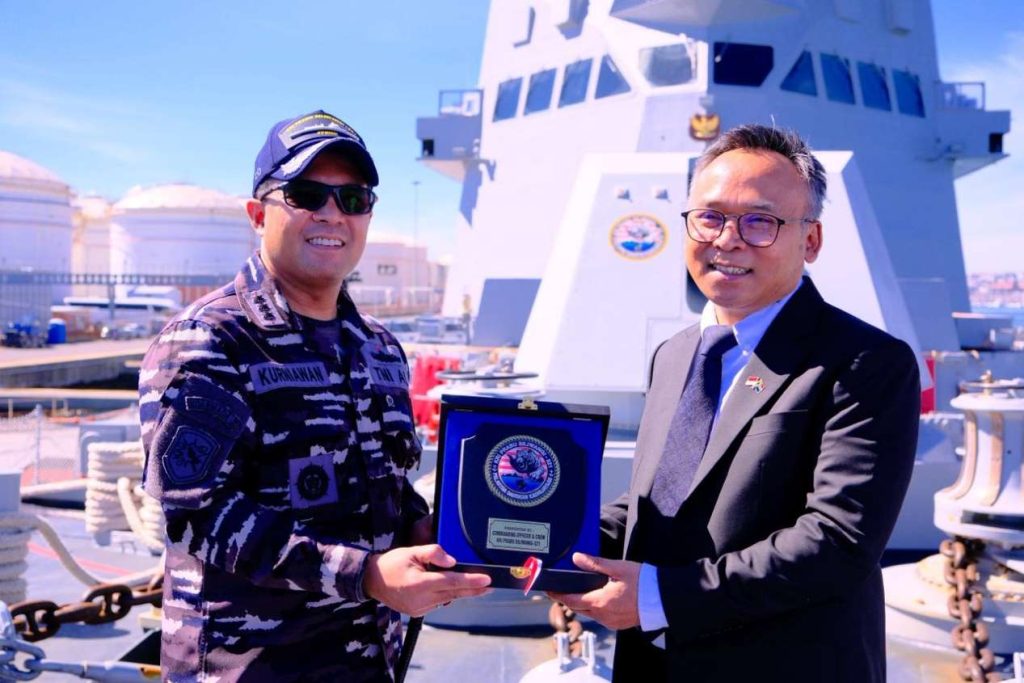 Pertukaran plakat antara Komandan KRI Prabu Siliwangi-321 Kolonel Laut (P) Kurniawan Koes Atmadja dan RADM Handsome Thamsanga Matshane dari South African Navy. (Foto: Ist) AFRIKA…