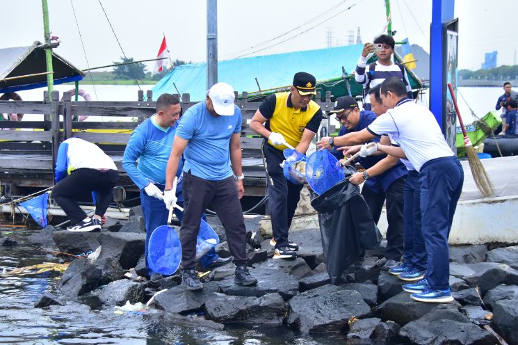 Personel Pushidrosal bersama prajurit dan PNS memungut sampah di kawasan Pantai Lagoon Ancol, Jakarta Utara, Jumat (13/2/2026), sebagai bentuk dukungan terhadap program Indonesia ASRI yang…
