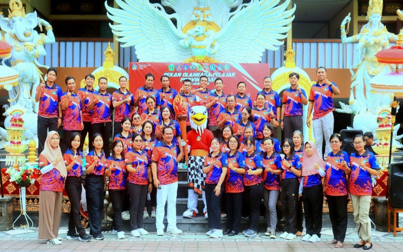 Defile Ceremony: Para atlet pelajar beserta para guru dan pelatih SMA Negeri 1 Amlapura yang menjadi bagian dari kontingen atlet pelajar Karangasem untuk berlaga di…
