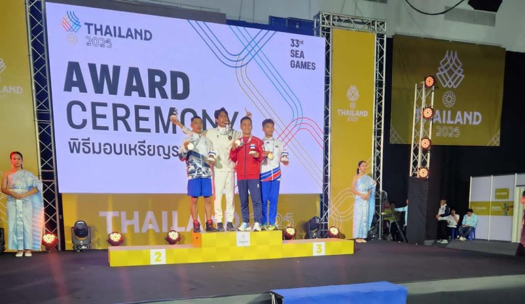 Bangga! Vicky Tahumil Junior berdiri di podium tertinggi, medali emas pertama untuk Timnas Tinju Indonesia di SEA Games Thailand 2025. (Foto: Ist) BANGKOK, NP –…