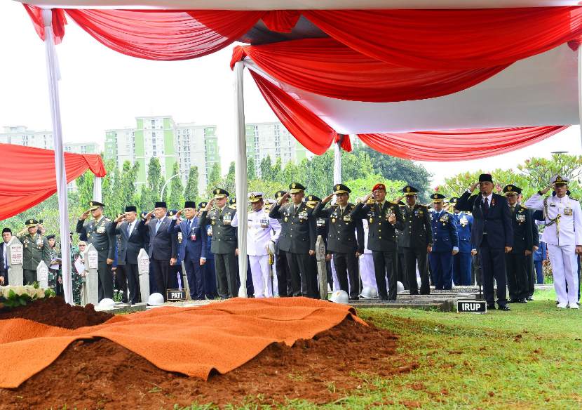 Suasana haru saat Wadan Seskoal Laksamana Pertama TNI Ferry Supriady dan tamu undangan mengikuti upacara pemakaman Prof. Juwono Sudarsono di TMP Kalibata, Minggu (29/03/2026).(Foto: Ist)…