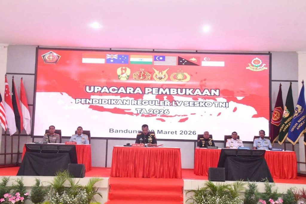 Suasana Upacara Pembukaan Dikreg LV Sesko TNI TA 2026 di Gedung Serasan Sesko TNI, Bandung, Senin (30/3/2026), yang dipimpin Wakil Panglima TNI Jenderal TNI Tandyo…